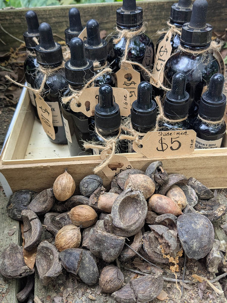 Warm brown ink, made in small batches in partnership with the squirrels in our backyard. Our yard has black walnut trees, and the squirrels crack the nuts. We grab the hulls to ferment, boil, and bottle.