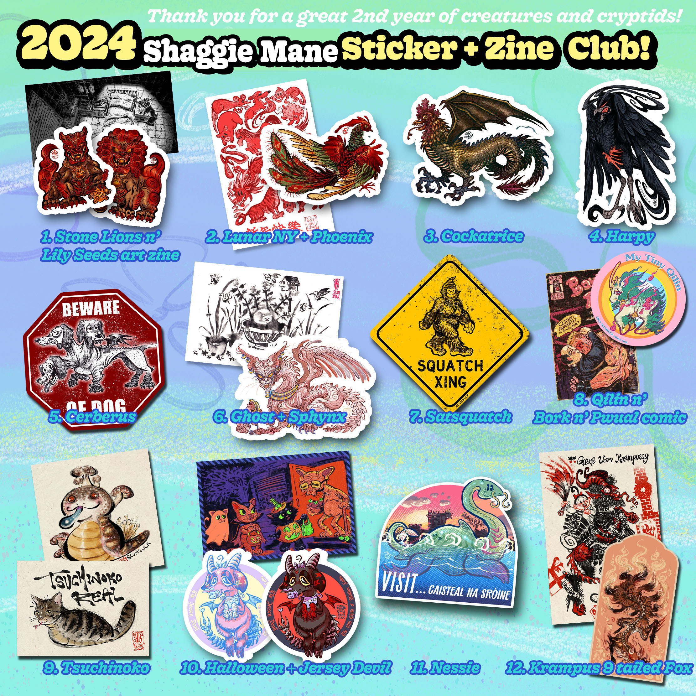 Creature and Cryptid themed stickers from our first year of the Shaggie Mane Sticker Club. Sticker Club subscribers can request art from me, and receive monthly letters in the mail that include stickers, zines, custom sketches, and postcards. The designs for Sticker Club are exclusive to subscribers for one year. After the year has passed, the stickers may be available on this store.